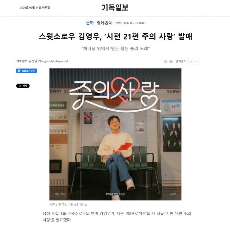[기사] 스윗소로우 김영우, ‘시편 21편 주의 사랑’ 발매(기독일보)