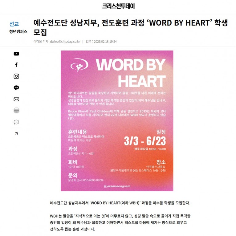 [기사] 예수전도단 성남지부, 전도훈련 과정 ‘WORD BY HEART’ 학생 모집(크리스천투데이)